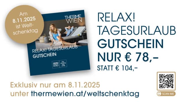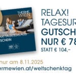 * Nur gültig für einen weiteren Relax! Tagesurlaub in der Therme Wien innerhalb von 30 Tagen nach Konsumation eines Relax! Tagesurlaubes.
